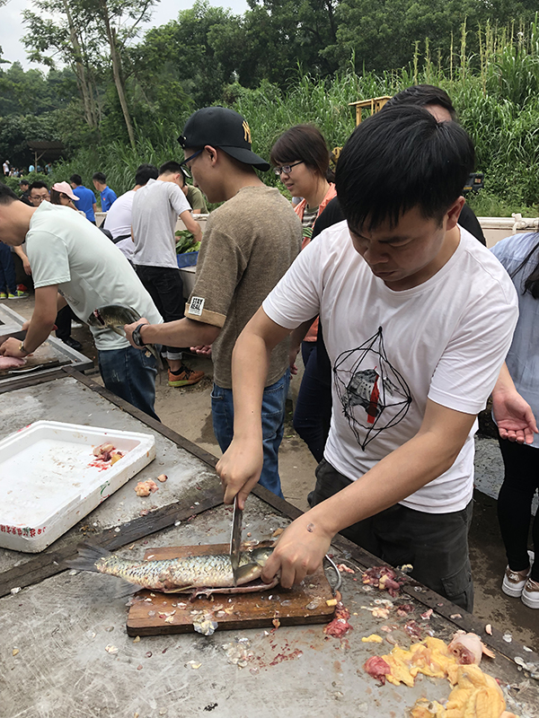 中午時(shí)分,便是野炊。所有團(tuán)隊(duì)人員,爭(zhēng)先搶著擇菜,洗菜,切菜,個(gè)個(gè)上心,心靈手巧,神情專注,像柔指在琴弦上滑動(dòng),在琴鍵上跳動(dòng),那些菜在他們手上簡(jiǎn)直就是蝴蝶、蜻蜓、花朵,一劃一撥,簡(jiǎn)直是在寫詩(shī)。如此曼妙,此景只有人間樂,誰(shuí)聞天堂有此景。做菜烹調(diào)是難事,也是易事。說(shuō)難,菜到什么味口,是有級(jí)別的,那是廚師的事,說(shuō)易,人人搶著炒菜,沒誰(shuí)說(shuō)不好,照樣吃得津津有味,興趣盎然,好味,好味……一桌十幾樣菜,花花綠綠,群星燦爛,是勞動(dòng)成果,是智慧結(jié)晶,亦如我們團(tuán)隊(duì)業(yè)務(wù)上的成果,耀眼、驕人……